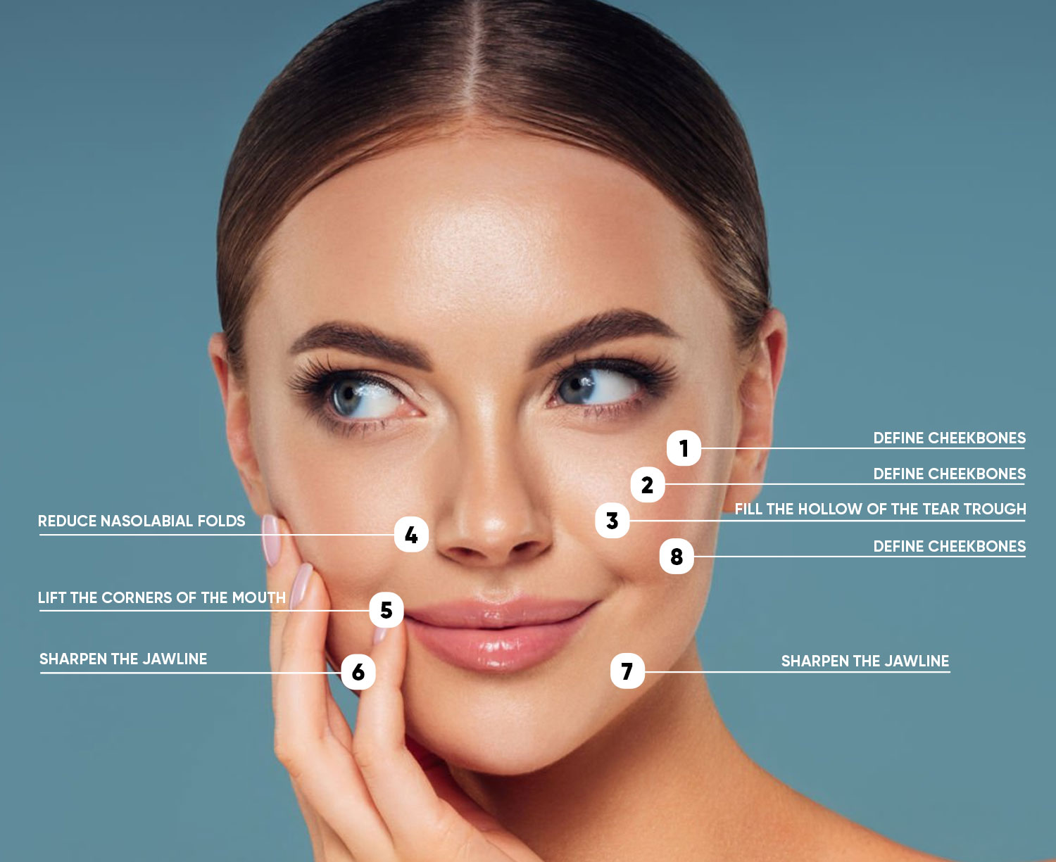 Our diagram illustrates the 8 separate injection points treated in the 8-point facelift: